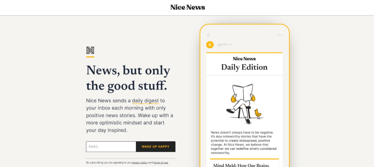 Nice News: News, but only the good stuff. Nice News sends a daily digest to your inbox each morning with only positive news stories.