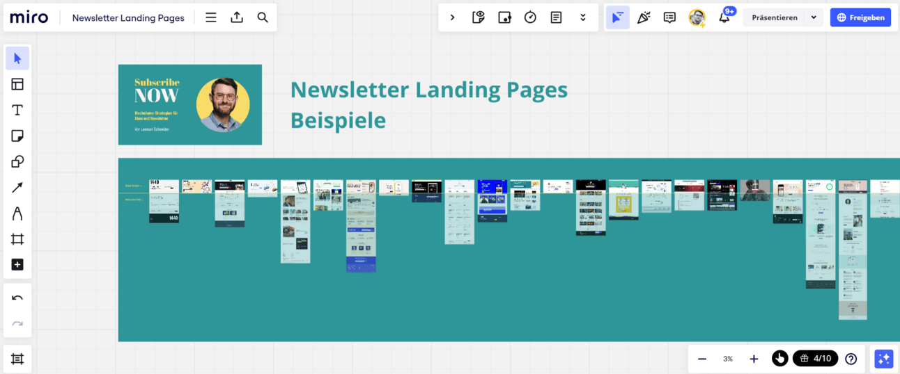 Wenn du dir selbst einen Eindruck verschaffen willst, habe ich hier 40+ Beispiele von führenden Newslettern in einem Miro-Board gesammelt.