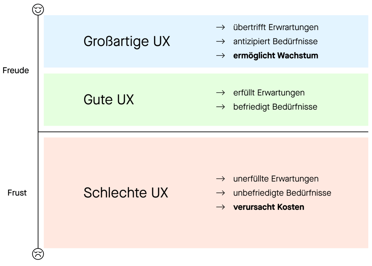 Michael stellt dafür eine einfache Formel auf: Gute UX stärkt die Kundenbeziehung und schafft Wachstum, z. B. weil Kunden begeistert davon erzählen, schlechte UX führt zu Frust und damit zu Churn.