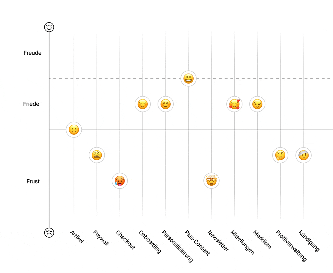 Um das zu visualisieren arbeitet er mit einem simplen Diagramm, das von "Extremer Frust" bis "Extreme Freude" reicht. In der Mitte liegt eine Zufriedenheitsschwelle. Ziel sollte sein, bei jeder Interaktion zumindest die Zufriedenheitsschwelle zu erreichen und im besten Fall die Erwartungen weit zu übertreffen.