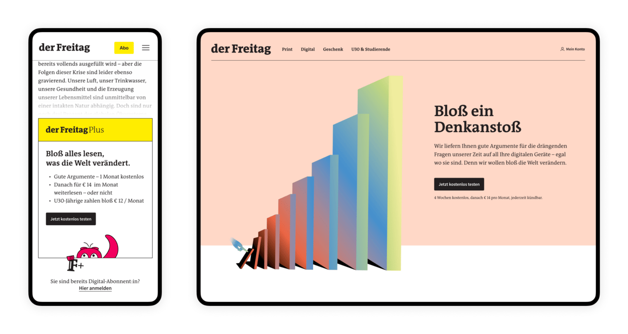 Beispiel: Hier siehst du das Markenprofil für die Wochenzeitung “Der Freitag” und die entsprechende Umsetzung an der Paywall und im Abo-Shop