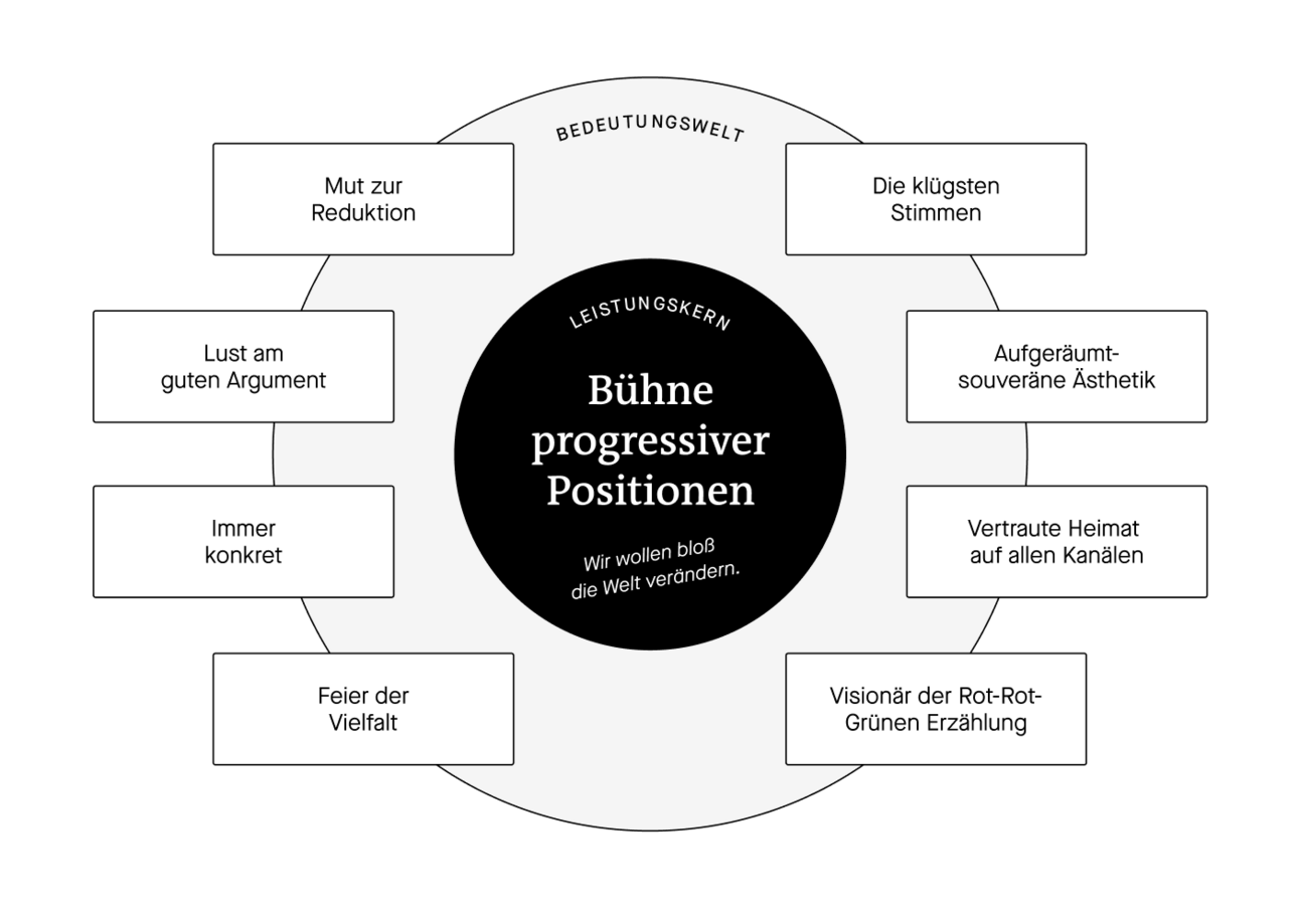 Make Studio arbeitet am liebsten mit einem simplen Kreis: In der Mitte steht der Leistungskern, also ein Satz, was die Marke der Nutzer*in verspricht.