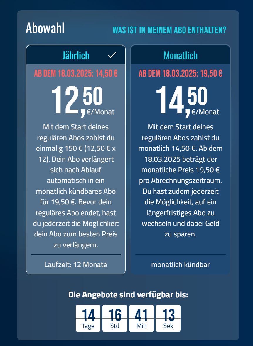Eine Taktik fand ich besonders ungewöhnlich: Im März haben sie die Preise erhöht und statt das Thema schamvoll zu verschweigen, haben sie es als Anlass für eine Marketing-Kampagne genutzt. Auf der Bestellseite wurde die Preiserhöhung bereits angekündigt und wer sich vor dem Stichtag entscheidet, konnte sich noch den alten Preis sichern. Das Ganze wurde unterstrichen mit einem Countdown.